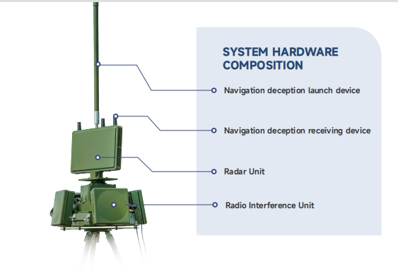 The system integrates spectrum monitoring, radar, radio interference, and drone deception, achieving detection, interference, and deception of drones.